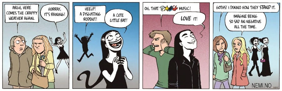 - Added the name of the strip and artist. I think the artist deserves a much higher profile in the US than she currently has. The line art of the goths in panels 2 and 3 is masterful, and the background goths in panels 1 and 4 show a perfect balance of minimalism and detail. Tellingly, the non-goths all look like caricatures of actual people rather than just generic cartoon characters. Importantly, this particular strip isn’t just going for a gag, it also aims to expess a truth about “dark culture” and its relationship to the world. Anyway I think the name of the cartoon and its artist deserves to be prominently placed on the image; this isn’t usually done on the images floating around the internet. (they often have the “nemi.no” url, but this forwards to a facebook page which doesn’t even mention the artist, and which only shows 2-3 entries before refusing to do any more unless you make a facebook account.)