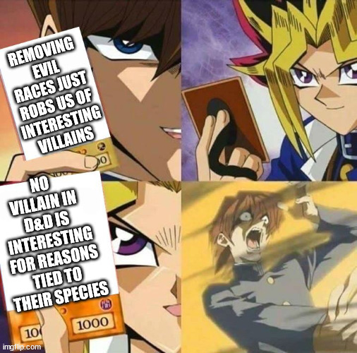 Every time people lament changes to the lore that amount to “not every member of species X is irredeemably evil” and claim the game is removing villains from it, I think how villains of so-caleld evil species fall into two cathegories: a) bland and boring and b)have something else, unrelated to their species going on for them, that makes them interesting.