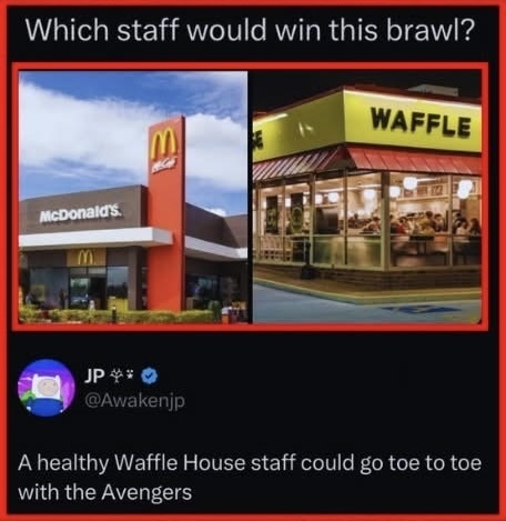 Although to be fair the Waffle House staff would more likely be on the same side as the Avengers. Save their asses with a chair to Thanos’ head or something.