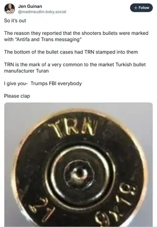Even that’s doubtful because Turan don’t manufacture 30-06. More likely it’s entirely fabricated and the “TRN” is either someone joking about it or, yes, the dumbest investigative “journalism” in the world but without an actual pic of ammo from the shooting.