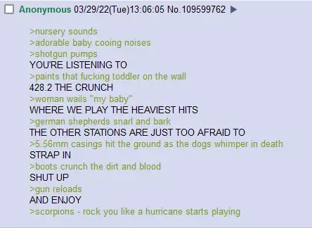So greentext is usually used like quotation marks or asterisks to denote roleplaying. Here it’s being used to denote a soundboard like radio DJ’s use.