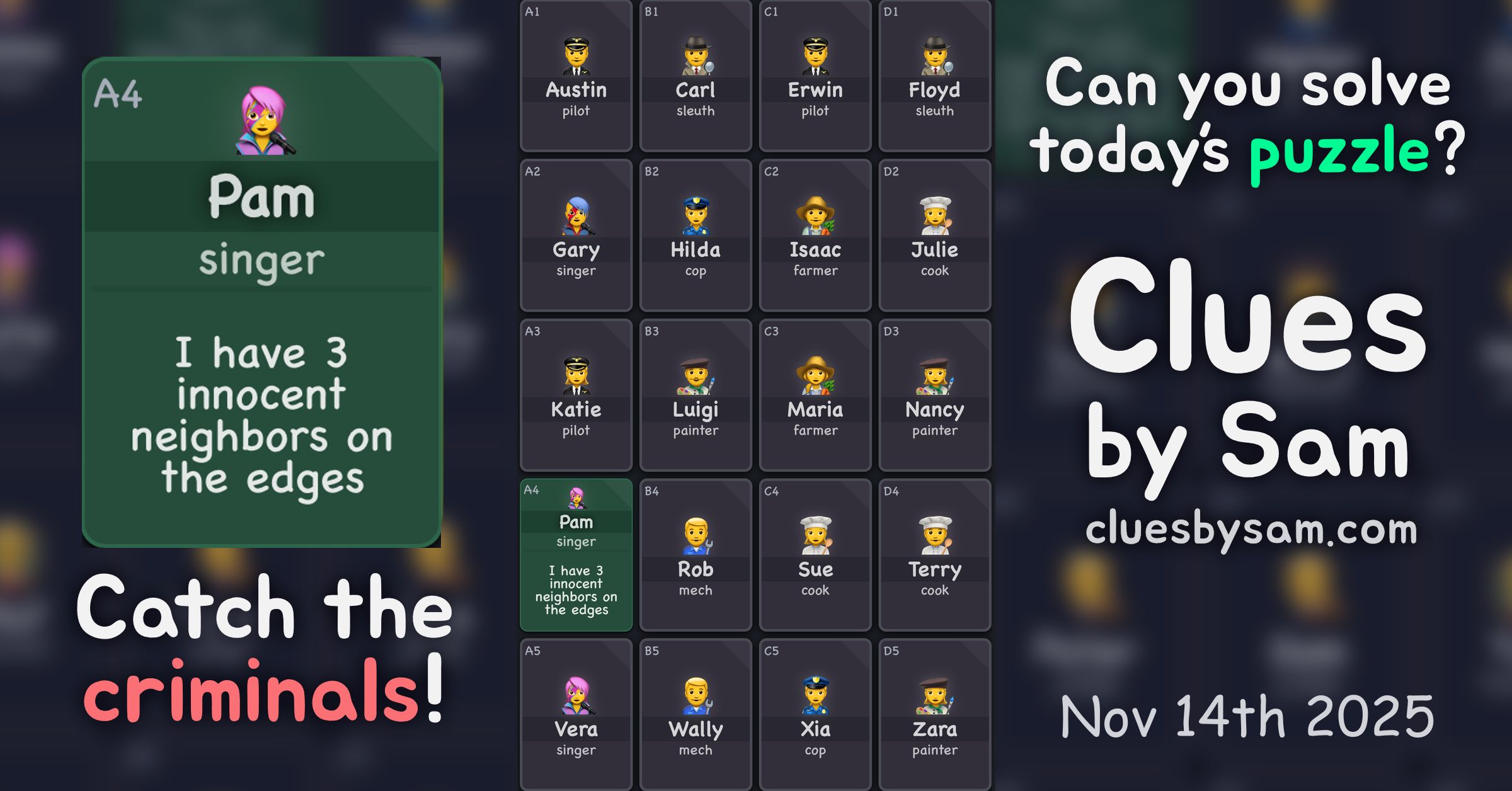 I solved the daily Clues by Sam (Nov 12th 2025) in 02:18 🟩🟩🟩🟩 🟩🟩🟩🟩 🟩🟩🟩🟩 🟩🟩🟩🟩 🟩🟩🟩🟩 https://cluesbysam.com/